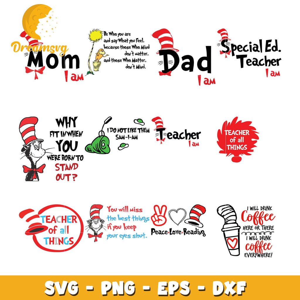 Cat in the Hat Teacher SVG Bundle is part of our exciting Dr. Seuss collection! Perfect for crafters, teachers, and fans of all ages, these high-quality scalable designs feature beloved characters like the Cat in the Hat, Thing 1 and Thing 2, and Horton. Ideal for creating classroom decorations, custom t-shirts, party invitations, or nursery decorations, these files work seamlessly with Cricut, Silhouette, and other cutting machines. Whether you're celebrating Read Across America Day or adding a playful touch to your DIY projects, our Dr. Seuss SVGs will spark imagination and creativity. Start crafting your Seussian adventure today!